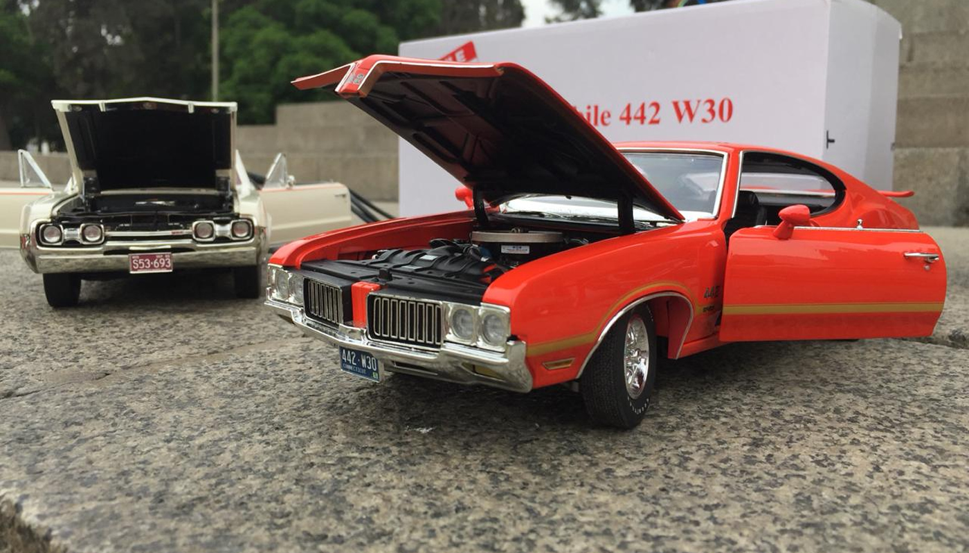- 2 Oldsmobile 442 de 1967 (blanco) y 1970 (naranja)