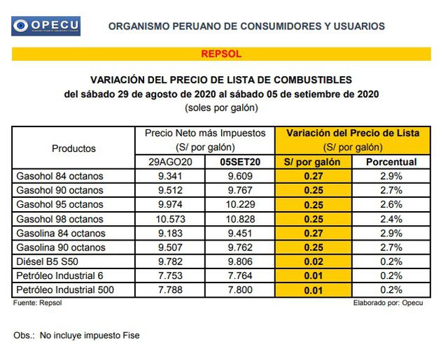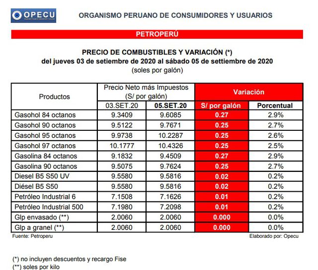 El alza en esta oportunidad se ha dado hasta en 2.9% por galón, incluidos impuestos, el diésel B5 en 0.2% por galón y residuales en 0.1%. Las nuevas listas de precios rigen del sábado 5 de setiembre de 2020.