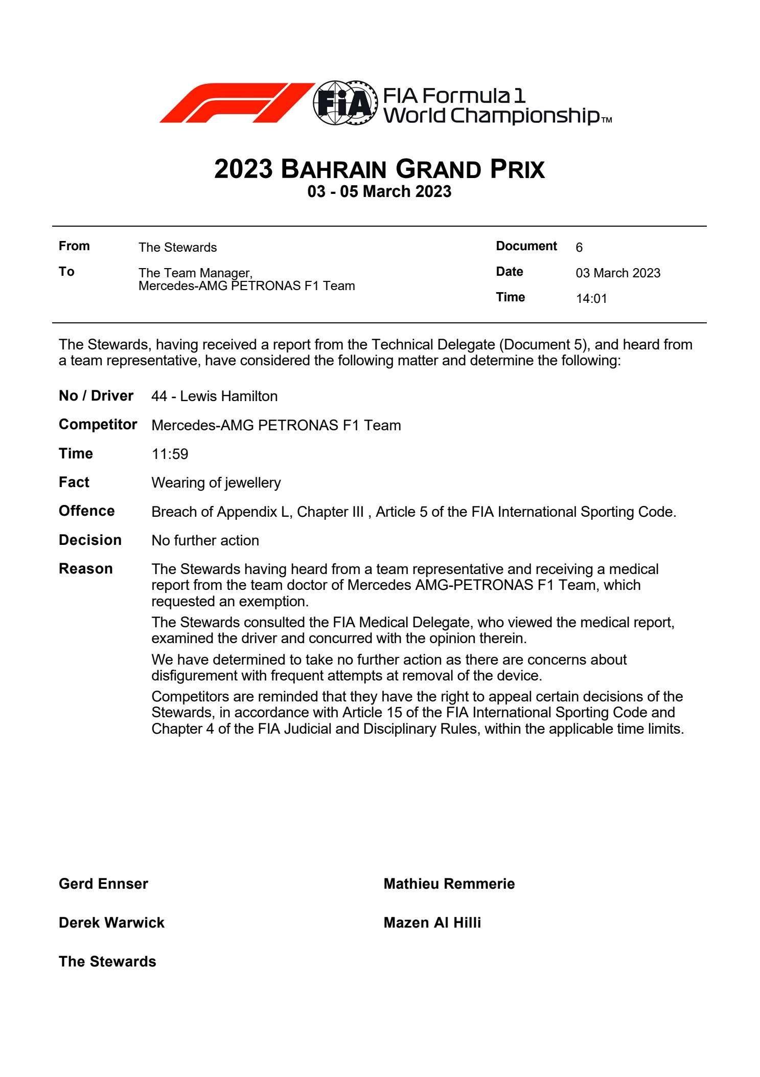El GP de Bahréin arrancó levantando polvo. El 3 de marzo, nueve equipos reportaron que sus pilotos cumplieron con la regla de no usar joyas. El equipo que no hizo esta confirmación fue Mercedes. Ese mismo día, la Federación Internacional de Automovilismo (FIA) admitió con medio año de tardanza el documento médico que permite a Lewis Hamilton usar piercings en la nariz. La historia no es nueva. En el 2022, durante el Gran Premio de Singapur, Hamilton explicó que llevaba la joya por recomendación médica porque cuando intentó retirarla sufrió una infección. Ante esta situación, la FIA reaccionó aplicando una multa de más de 26 mil dólares.