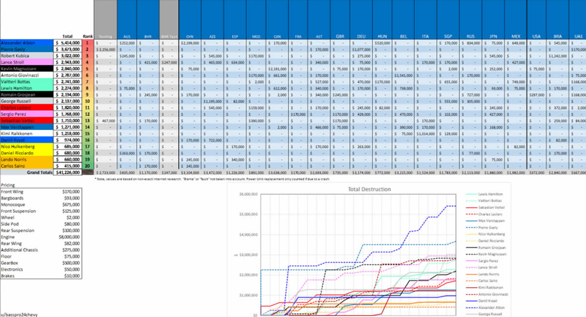 Entre los más destructores tenemos en primer lugar a Alexander Albon, de Red Bull, con USD 5 414 000 de gastos en reparaciones, solo en el GP de china tuvo un gasto de más de dos millones de dólares, por su accidente en los terceros entrenamientos libres, donde destrozó completamente su auto.