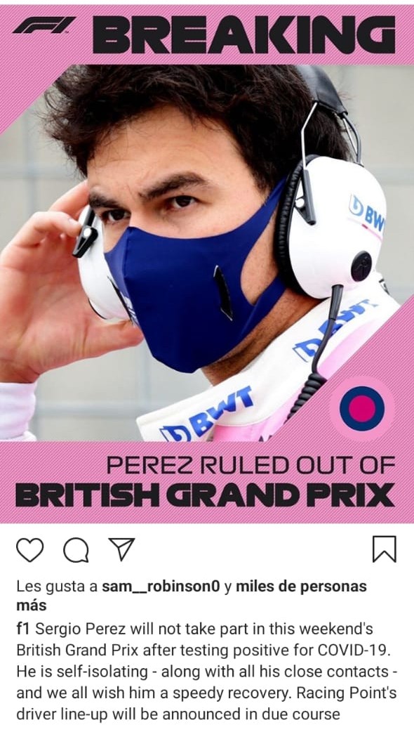 Se confirmó que el mexicano Sergio Pérez es el primer piloto de la Fórmula 1 en dar positivo a Coronavirus. Él queda fuera de la competencia.
