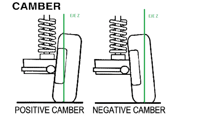 Este ángulo es la inclinación de las ruedas, medida en grados cuando se ve desde el frente del vehículo hacia adentro o hacia afuera del vehículo. Cuando la rueda esta inclinada hacia adentro en su parte superior, el camber es negativo y positivo cuando la rueda esta inclinada hacia afuera en su parte superior.