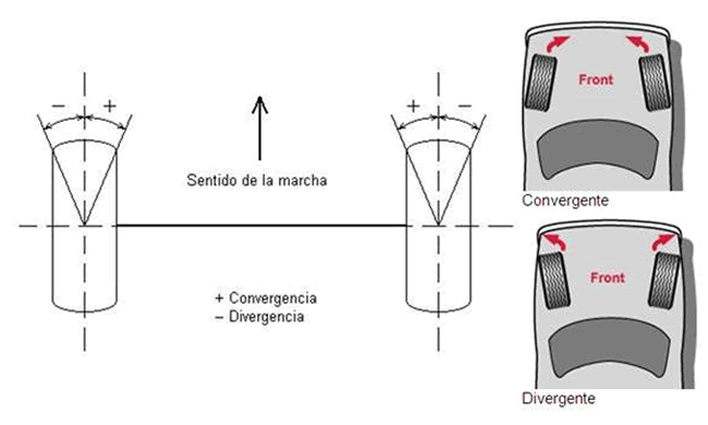 Es la diferencia en la distancia de la parte trasera y delantera de las ruedas frontales, se mide en unidades de distancia, pero puede ser medida también en grados. Convergencia positiva significa que la parte delantera de las llantas está más cerca que la parte trasera, convergencia negativa es lo opuesto.