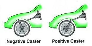 Ángulo de inclinación del eje: llamado también Caster. Al girar el volante, las ruedas realizan un movimiento sobre un pivote unido a la suspensión del vehículo; este ángulo será entonces el que forma la rueda con el pivote, comparado a una línea imaginaria vertical que pasará por el centro de la rueda, visto lateralmente.