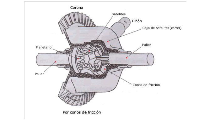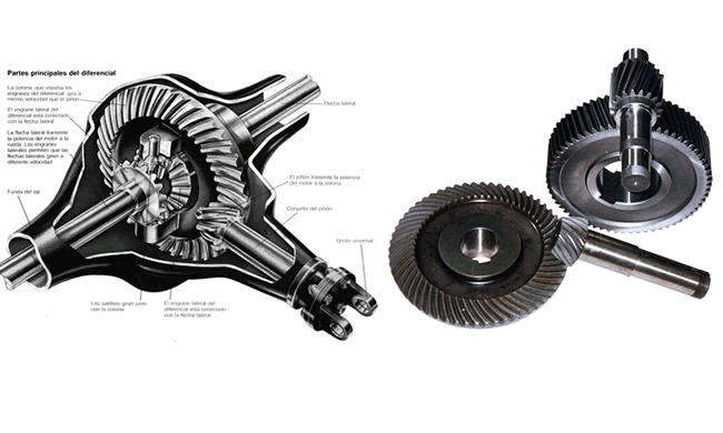 Junto con la corona tenemos el diferencial. Formado por 4 engranajes cónicos, dos planetarios y dos satélites. Los planetarios, cada uno de ellos va a una transmisión (rueda) y los satélites que están unidos a la carcasa que abarca a todos. Este sistema de engranajes se emplea para transmitir el mismo par y giro a ambas ruedas tractoras en tramos rectos, pero en las curvas, uno de los piñones planetarios girará más despacio que el otro; debido a que en las curvas la rueda interior tiene que hacer menos recorrido que la exterior. En el giro es como si se bloqueara un planetario, haciendo girar a los satélites que a su vez aumentan el giro del otro planetario.