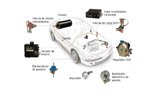 Para poder aplicar el GNV en un motor de encendido por chispa, es necesaria la instalación de elementos que componen el equipo de conversión, como el cilindro de almacenamiento, regulador, inyectores o mezclador, tuberías de alta y baja presión, componentes electrónicos, válvulas y conexión de llenado.