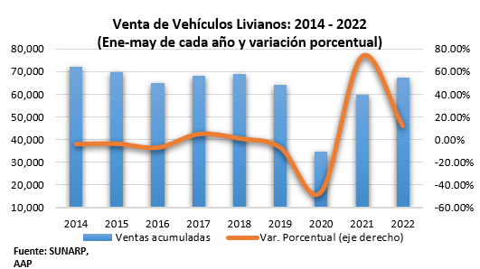 Según cifras oficiales de la Superintendencia Nacional de Registros Públicos (Sunarp), al cierre de mayo de 2022, se vendieron 14,356 vehículos livianos, evidenciando un crecimiento de 14.6% respecto a similar mes del 2021. En tanto, durante los primeros cinco meses de este año, las ventas se ubicaron en 67,260 unidades, con una expansión de 12.2% si lo comparamos con similar periodo del 2021. Al desagregar la información de los vehículos livianos podemos observar que se vendieron 28,941 SUV entre enero y mayo del 2022, incrementándose 26.6% respecto a igual periodo del 2021. Mientras que, la venta de pick up y furgonetas avanzó a 14,121 unidades en el periodo de análisis (+25.2% interanual). De otro lado, las ventas de camionetas ascendieron a 7,795 unidades (+1.2% interanual). No obstante, la comercialización de automóviles y station wagon retrocedió a 16,403 unidades (-9.3% interanual). Al analizar los resultados, Morisaki comentó que el incremento en la venta de vehículos livianos en los primeros cinco meses del año responde a la recuperación del empleo e ingresos de los hogares, mayor acceso al financiamiento para la adquisición de estos bienes en línea con el repunte de los sectores económicos que venían rezagados tras las primeras dos olas de contagio del COVID-19; además del impulso a una mayor presencialidad en centros educativos y de trabajo y el aumento de la movilidad de las personas en general.