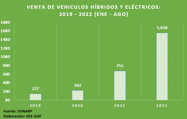 Al observar las cifras oficiales, comentó, que de acuerdo con la Superintendencia Nacional de Registros Públicos (Sunarp), la comercialización de vehículos electrificados llegó a 252 unidades en el octavo mes del 2022, reportando un significativo crecimiento de 73.8% frente a similar mes del año anterior. En tanto, durante los primeros ocho meses, las ventas se situaron en 1,638 unidades, y alcanzó un incremento de 117% en comparación con igual periodo del 2021.