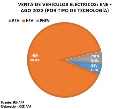 Morisaki resaltó que la participación por tecnológica dentro de los vehículos electrificados se ha ido modificando. En ese sentido, agregó que, aunque los híbridos convencionales son los de mayor preferencia, su participación se ha reducido de 94.7% en enero-agosto del 2021 a 89.99% de similar lapso en el 2022; mientras que, los híbridos enchufables y los puramente eléctricos vienen ganando terreno, al pasar de 3.05% a 5.43% y de 2.25% a 4.58%; en cada caso.