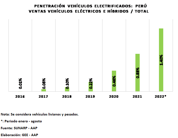 Para Morisaki, aun cuando, el aumento de las ventas de los vehículos electrificados en lo que va del año es positivo para el mercado automotor, dista mucho de lo observado de Colombia, el cual es uno de los países líderes en la región respecto a la transición hacia un parque automotor medioambientalmente sostenible. Según cifras de Andemos, durante los primeros ocho meses del 2022 en dicho país se vendieron 19,209 vehículos electrificados, es decir 90.8% más que en similar periodo del año anterior. De lo anterior, se puede advertir que nuestro vecino norteño ha comercializado cerca de 12 veces más de dichos vehículos que nuestro país. Adicionalmente, la penetración de la venta de vehículos electrificados en Colombia alcanza el 11.2%, es decir de cada 100 vehículos livianos y pesados comercializados en lo que va del 2022, 11 vehículos fueron electrificados; mientras que en Perú ese porcentaje apenas llega al 1.4%.