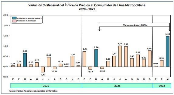 Luego de revisar información del Instituto Nacional de Estadísticas e Informática (INEI), el gremio automotor indicó que la variación mensual reportada en marzo del 2022 ha sido la más alta desde febrero de 1996, es decir hace 26 años, cuando llegó a 1.53%. Con este resultado, la inflación del primer trimestre se situó en 1.84%, mientras que la inflación anual avanzó a 6.82%.