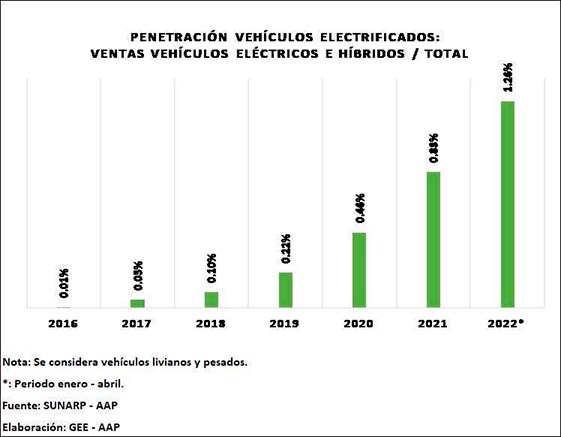 El avance sostenido en las ventas de vehículos electrificados se refleja también en el aumento de la penetración de estos vehículos, que al cierre de abril llegó a 1.26%, es decir por cada 100 vehículos livianos y pesados que se vendieron en el país en lo que va del año, 1 fue electrificado. Ahora, refirió Morisaki, si bien este porcentaje es el mayor desde que se registran datos, aún se ubica muy por debajo de países como Colombia, que revela una penetración de 11% en los primeros cuatro meses del 2022, con 8,520 vehículos electrificados comercializados.