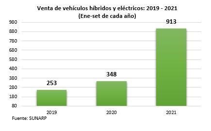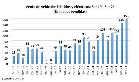 La venta de vehículos híbridos y eléctricos registró en setiembre su mayor tasa de crecimiento de este año. De acuerdo a cifras oficiales, durante el noveno mes del 2021, la venta de vehículos electrificados sumó 158 unidades, superando en 243.48% el nivel observado en setiembre del año pasado.
