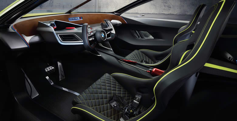 Reducido a un mínimo, el interior del BMW 3.0 CSL Hommage pone su diseño ligero en el programa y hace que su carácter racing elegantemente tangible. Todos los elementos del interior están ahí por necesidad absoluta, cada parte tiene un diseño de alta calidad, estructura o función drive-relacionados. En el todo CFRP interior, la única presencia madera-como es el "panel de instrumentos" - un elemento transversal y elemento puramente estructural. Esta es una clara referencia al interior de la anterior