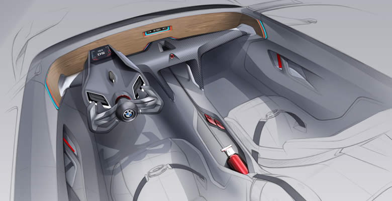 BMW 3.0 CSL, que contó con una madera versátil recortar en todo el interior. En la nueva versión, sólo la pequeña eBoost central de la pantalla de carga interrumpe el panel de instrumentos de madera. Infotainment es igualmente minimalista en concepto: una pantalla central de la columna de dirección informa al conductor del tren, la velocidad, revoluciones y desplazamiento del punto actual.