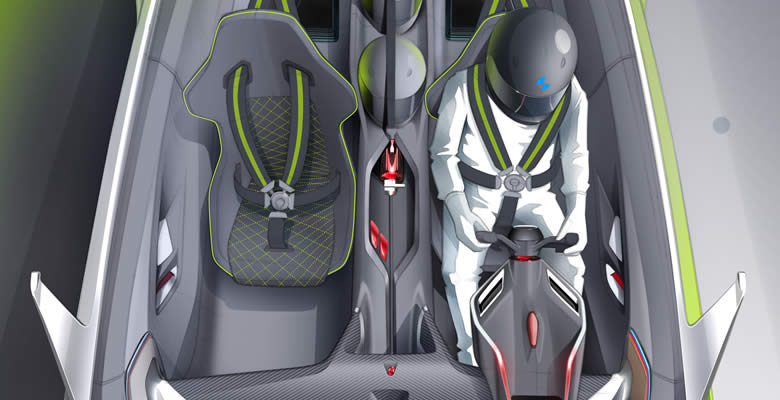 Otras características incluyen carreras de los asientos de cubo con costuras de alta calidad, una serie de características de seis puntos del cinturón de seguridad y anodizado de color rojo, como las boquillas de salida de la espuma de extinción de, el propio extintor, y los dos interruptores en la consola central para la parada de seguridad apagado y de extinción de incendios mecanismo. Los únicos elementos en la parte trasera del vehículo son dos cascos integrados en el túnel de transmisión. Estos se mantienen en su lugar por un cinturón cuando no esté en uso. En el lugar de un asiento trasero, hay sólo cubre a los acumuladores de energía eBoost. La tecnología especial de reflector en combinación con tiras de LED crear un impresionante efecto 3D en las portadas.