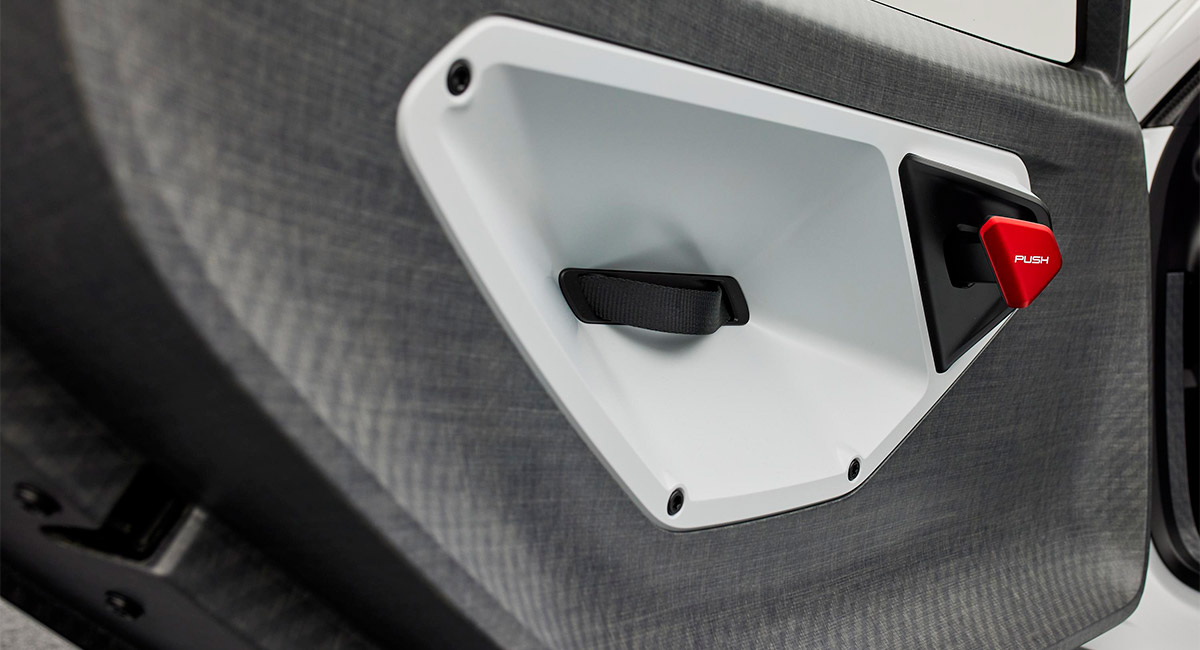 El diseño del habitáculo está totalmente centrado en el conductor. Una pantalla perfectamente ubicada entre los controles del volante muestra datos relevantes durante la carrera. Otro monitor situado sobre la columna de dirección sirve para proyectar las imágenes de las cámaras de los espejos retrovisores laterales y del espejo retrovisor central. Una pantalla táctil ubicada a la derecha del asiento permite consultar, entre otros, los datos biométricos del conductor. En el prototipo pueden ser instaladas más cámaras en el interior para conseguir extraordinarias tomas en una transmisión en directo.