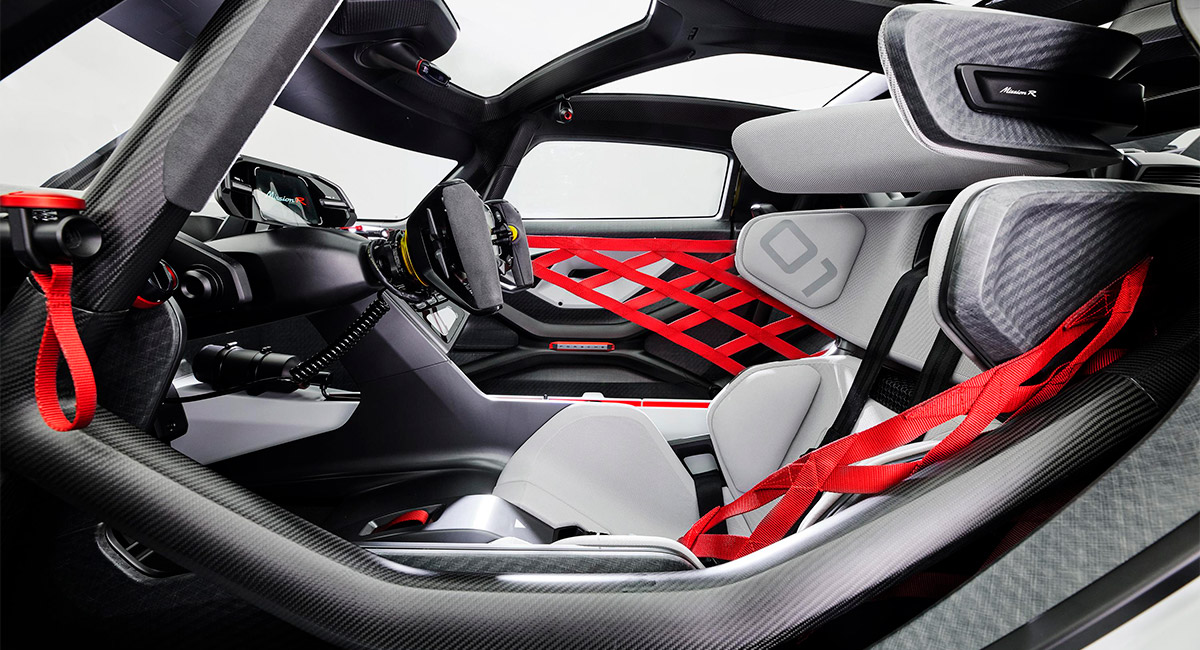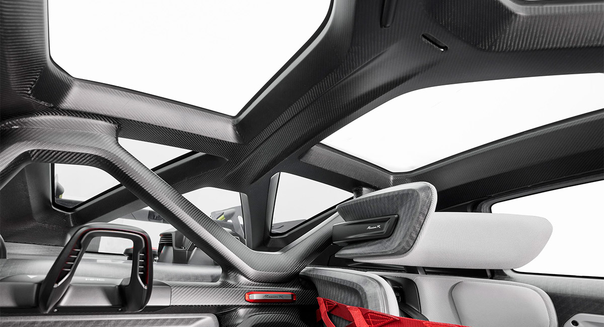 Con el proyecto Mission R, Porsche acerca más que nunca las carreras reales y las virtuales. El puesto de conducción en el chasís monocasco del vehículo recuerda a un simulador de juegos electrónicos. La estructura de seguridad, hecha de material compuesto de fibra de carbono, combina un alto nivel de protección para el conductor con un peso reducido y un espectacular diseño. Los ingenieros y diseñadores de Porsche han denominado ‘exoesqueleto’ a la estructura de techo de carbono recientemente desarrollada, que integra la jaula de seguridad y la sección externa del propio techo. Con 4326 milímetros de longitud, el Porsche Mission R es ligeramente más corto que el actual 718 Cayman. También es bastante más ancho (1990 milímetros) y tiene una altura significativamente más baja (1190 milímetros).