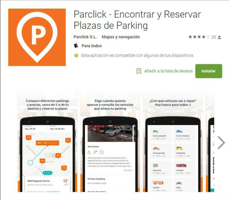 Parkclick. Brinda descuentos en parkings afiliados. También se puede reservar a un espacio en estos lugares y acceder mediante un localizador. Disponible en Android e iOS.