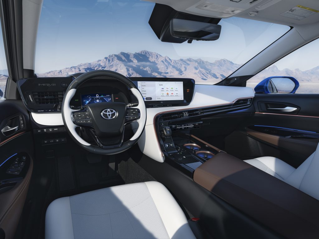 La pantalla de 12,3 pulgadas brinda acceso al conductor o el pasajero delantero. El contenido multimedia, de control de clima y de navegación se puede alternar de izquierda a derecha. El Toyota Mirai 2023 está equipado con el sistema Toyota Audio Multimedia. Los usuarios pueden interactuar con el sistema a través de controles táctiles intuitivos y de activación por voz.